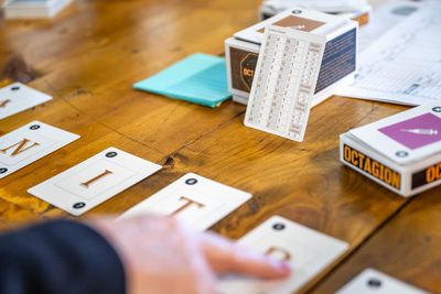 Organize multiple cards. Make stacks of letters that appear more than once in the deck (e.g., if the word is “OCTAGION,” put all O’s in one pile, all C’s in another, etc.).